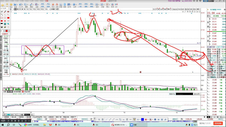 前面从二十点五二这个位置上涨,可以看到这里面的中枢,所以它背十的点是在这,实际上连一个一脉都没有,只是一个二脉。现在如果朝下看,这里是下跌中的第一个中枢,这个位置有可能构建下跌中第二个中枢再向下去除被磁性的埋点。